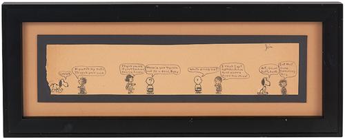 There’s a piece of Jim Morrison artwork up for auction at Lelands, and Charles M. Schultz would be outraged! Doors front man Jim Morrison was quite the cut-up, as evidenced by this humorous original artwork incorporating pasted-on Peanuts character cut-outs with his own handwritten dialogue. It is, of course, loaded with sexual overtones. The first frame depicts Snoopy growling at Pigpen, who replies, “If you bite my balls, I’ll suck your c–k.” The second frame shows Lucy pleading with Charlie Brown: “I’ll give you 15 [cents] if you’ll f–k me, Charlie Brown,” to which he replies: “Throw in your tricycle and it’s a deal, Baby.” In the third frame, Charlie Brown asks Linus, “What’s wrong kid?” to which Linus answers: “I think I got Syphilis from that whore down the street.” Snoopy gets the last word, er, sort of: “Arf, growl, ruff, bark,” to which Pigpen replies: “Cut that damn swearing out dog.” The strip is done entirely in the hand of Morrison and signed “Jim” in the upper right corner. On construction paper, the “artwork” measures 13.5″ x 3” and it is in EX-MT condition. Good grief!
