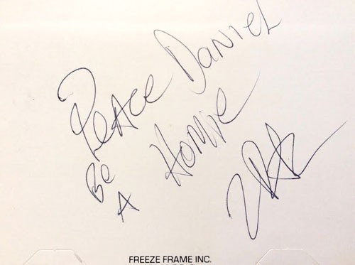 A souvenir photograph from the Viper Roller Coaster at Six Flags Magic Mountain Theme Park in Valencia, California, featuring Tupac and friends. The paper frame is inscribed, “Peace Daniel, Be a Homie, 2Pac.”