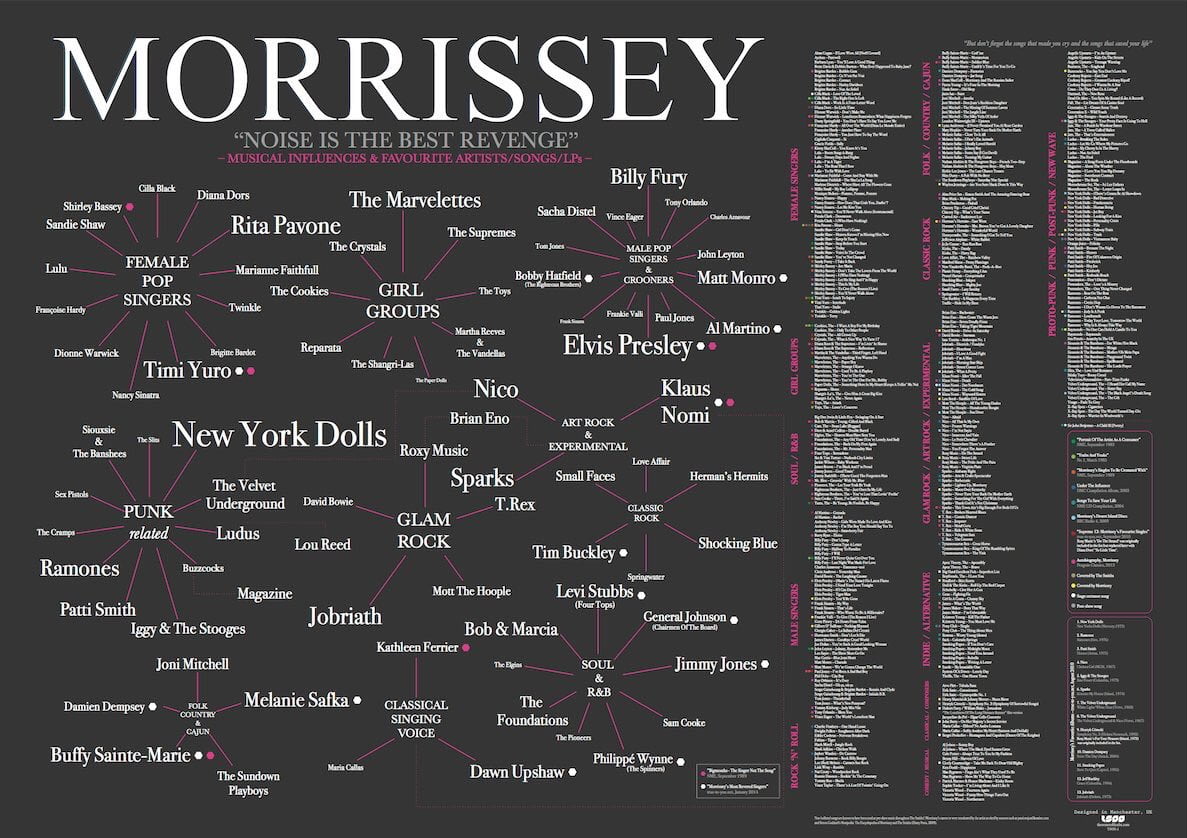 Check out this full, graphic exploration of Morrissey’s musical influences, from girl groups to glam rockers, pop idols to obscurities, created by Alejandro De Luna, and available for sale here. This music poster looks at the diverse artists and genres involved and joins them up in a comprehensive, endlessly fascinating infographic.