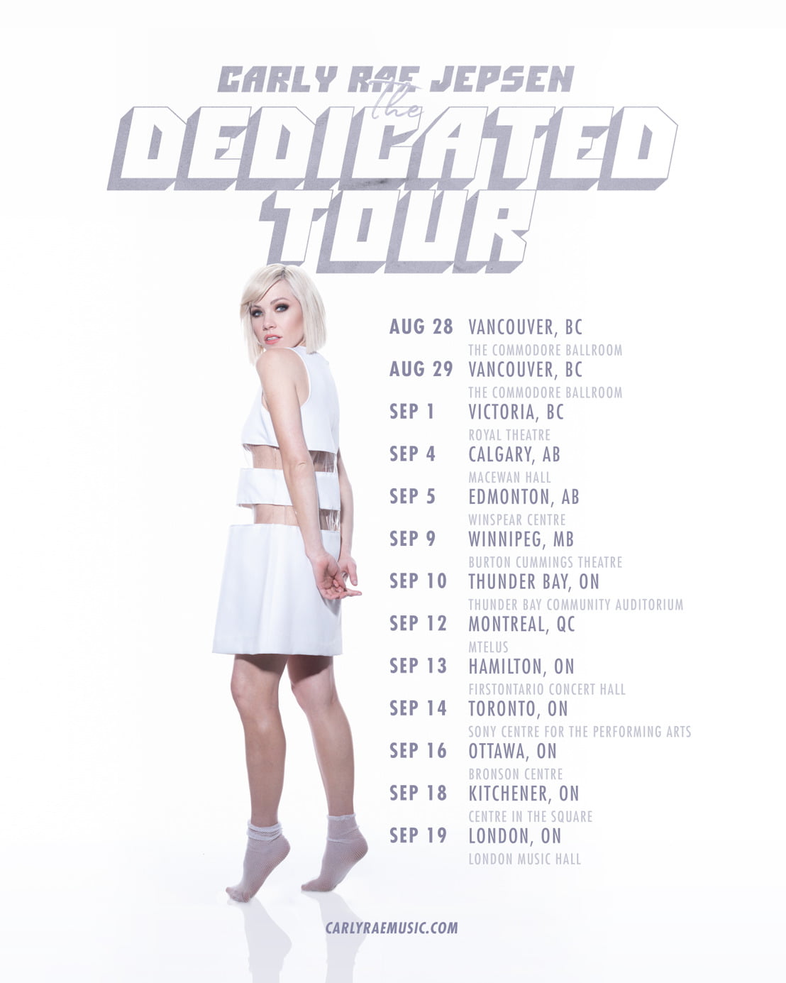 Today, Multi-platinum GRAMMY, JUNO Award and Polaris Prize nominated singer/songwriter Carly Rae Jepsen announces her Dedicated Canadian tour dates. Kicking off August 28, 2019 in Vancouver, BC the tour will hit 12 cities wrapping September 19, 2019 in London, ON.