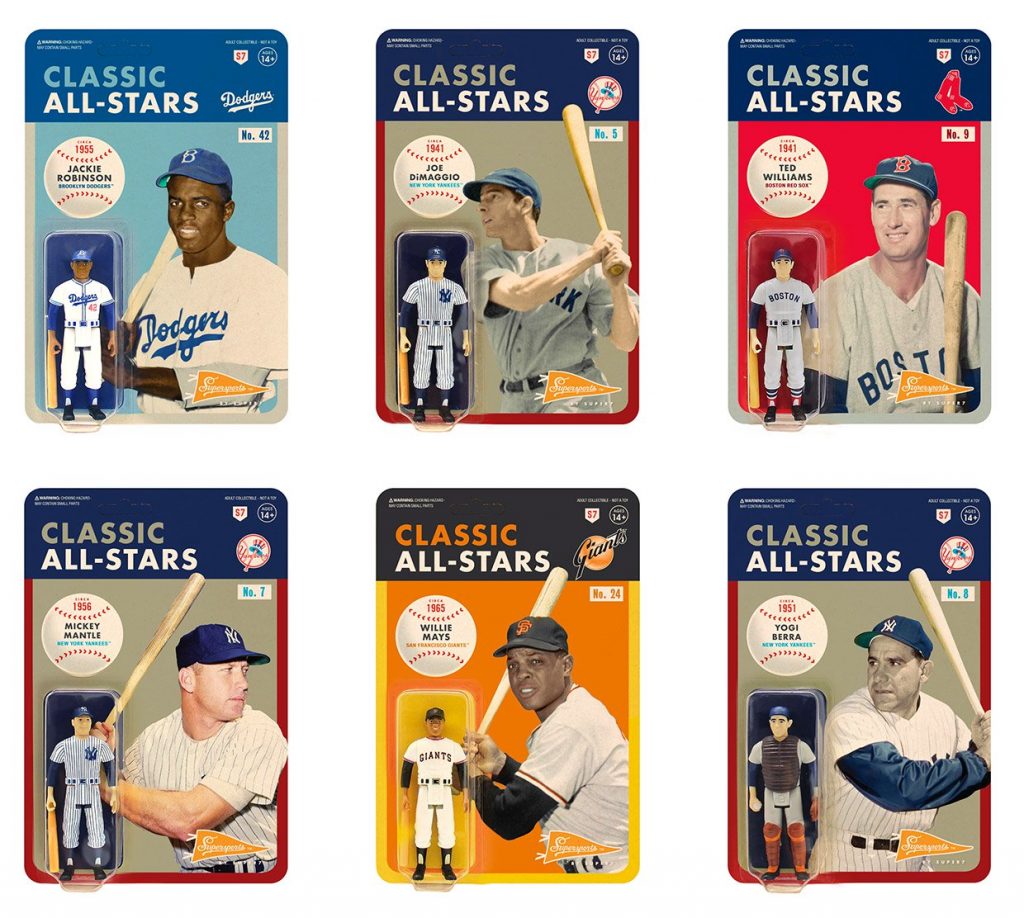 If you grew up with the Miracle Mets, Astroturf, ’75 Topps, Kelly Leak, the Crazy Crab, and the Bash Brothers, here’s your next gift to yourself. Toymaker Super7 presents a series of retro-style action figures inspired by major league baseball players, including greats like Willie Mays, Ted Williams, Jackie Robinson, Joe Dimaggio, Yogi Berra, the Phillie Phanatic, and more.