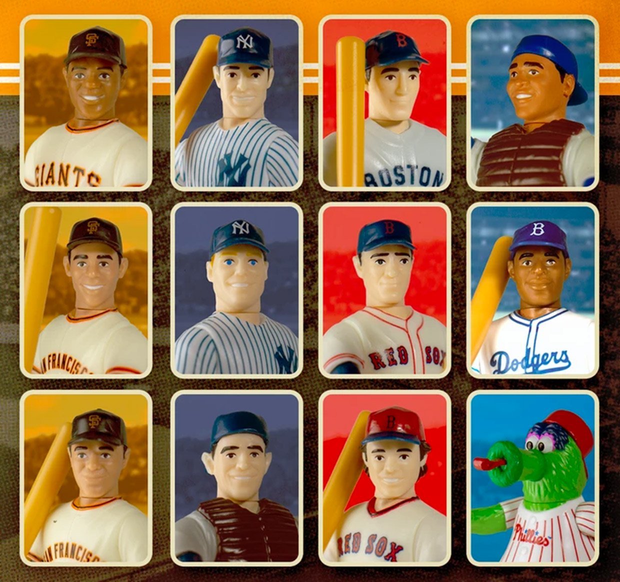 If you grew up with the Miracle Mets, Astroturf, ’75 Topps, Kelly Leak, the Crazy Crab, and the Bash Brothers, here’s your next gift to yourself. Toymaker Super7 presents a series of retro-style action figures inspired by major league baseball players, including greats like Willie Mays, Ted Williams, Jackie Robinson, Joe Dimaggio, Yogi Berra, the Phillie Phanatic, and more.