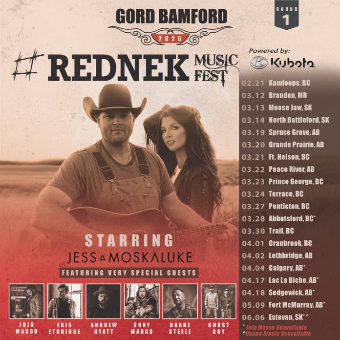 Multiple JUNO, CCMA and CMA award-winning singer/songwriter Gord Bamford will be hitting the road across Canada in 2020 with his #REDNEK Music Fest tour that will showcase a broad range of homegrown country music artists including the hottest emerging acts in Canada. Along with Bamford, the show stars multi-platinum, JUNO Award winner Jess Moskaluke, and an incredible line-up of rising talent including Andrew Hyatt, Cory Marks, Duane Steele, Eric Ethridge, Ghost Boy and JoJo Mason.