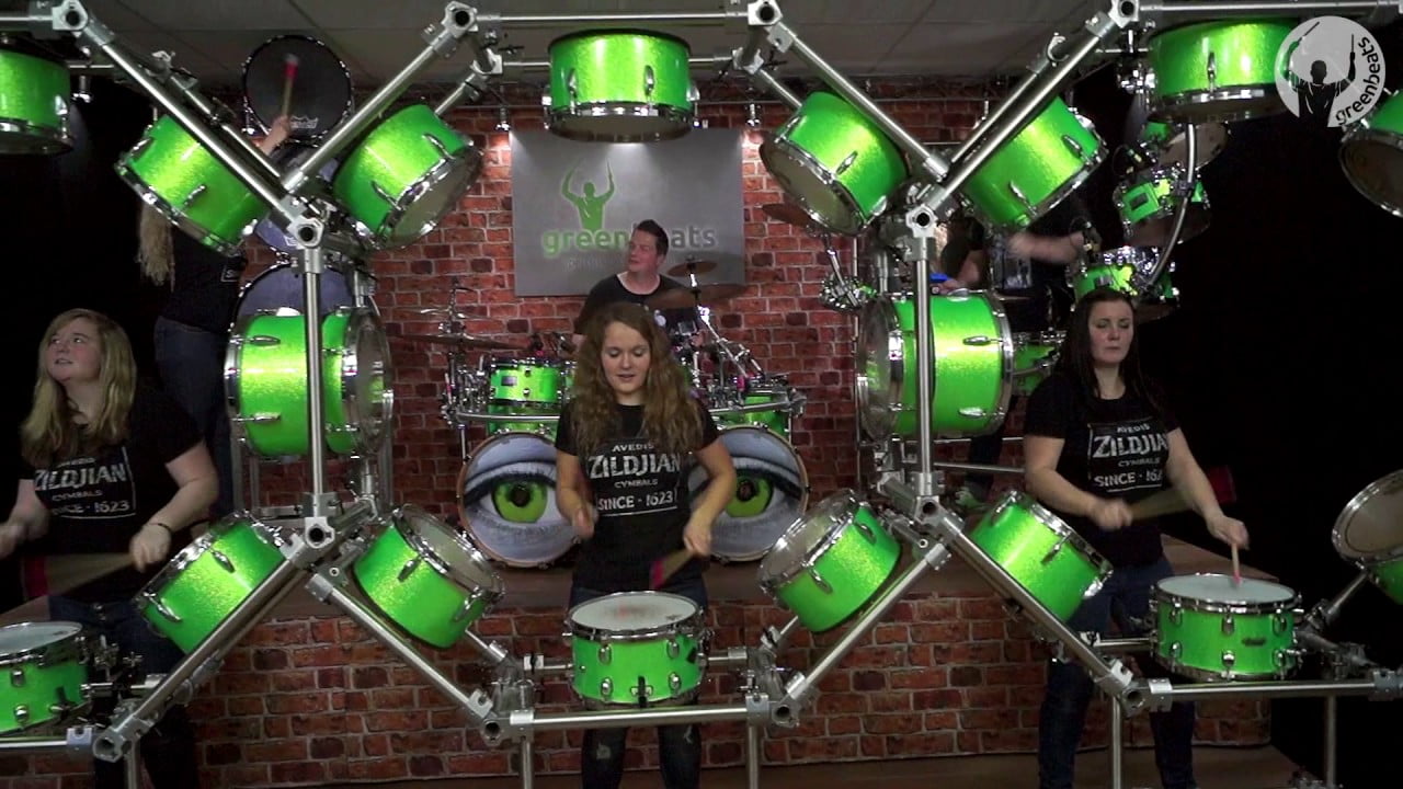 Music Drummers Play Eight Green Drums At The Same Time Feb 6, 2020 FacebookTwitterPinterestWhatsAppLinkedinReddItEmailPrint In this very cool video produced by the greenbeats percussion show, three female percussionists stand in the middle of a vertical circle play the eight green drums that line the circle. This rocks!