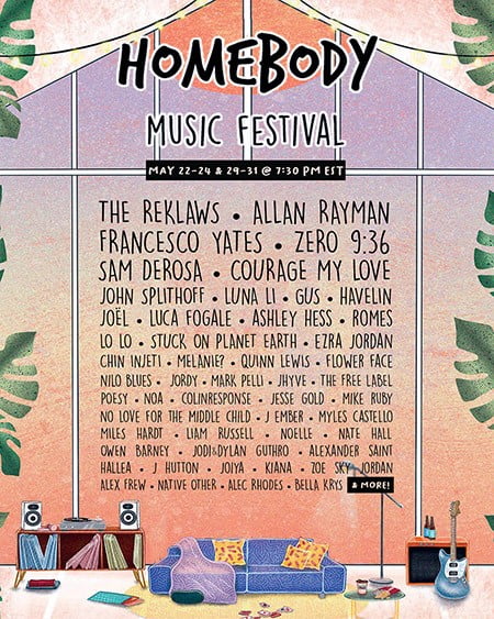 The Homebody Music Festival is scheduled for May 22nd, 23rd, and 24th and May 29th, 30th and 31st. Audiences can stream via YouTube Live and fans can donate here.