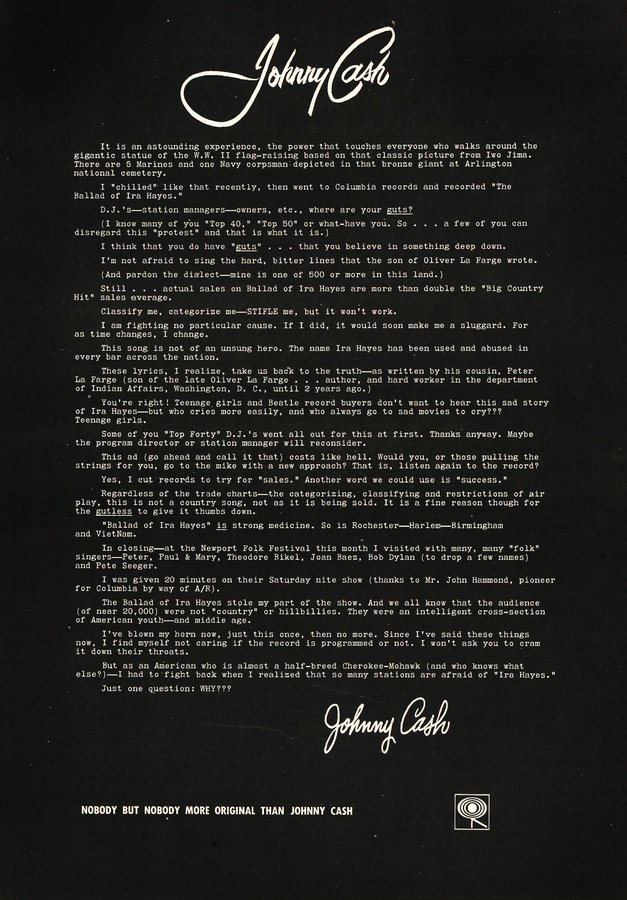 Music That Time Johnny Cash Asked Radio Stations, “Where Are Your Guts?” Nov 6, 2020 FacebookTwitterPinterestWhatsAppLinkedinReddItEmailPrint Johnny Cash fought for the rights of Native Americans and dedicated an entire album to them. When radio stations refused to play any of the songs, Cash purchased an ad in Billboard magazine asking, “Where are your guts?”