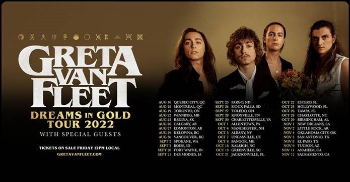 On the heels of their sold out Spring, 2022 Dreams in Gold arena tour Grammy-award winning rock band Greta Van Fleet announce new arena shows for this fall. Kicking off August 16 in Quebec City, QC the band will make stops in 42 cities across the U.S. and Canada; see below for a complete list of dates.