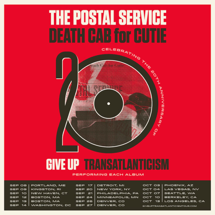 Indie rock titans The Postal Service and Death Cab for Cutie have today announced plans for a landmark 20th anniversary co-headline North American tour. The extraordinary live run will see both iconic groups performing their seminal 2003 albums in full – The Postal Service’s RIAA Platinum-certified Give Up and Death Cab for Cutie’s RIAA Gold-certified breakthrough fourth studio LP Transatlanticism – two classics released within a mere eight months of one another that year.