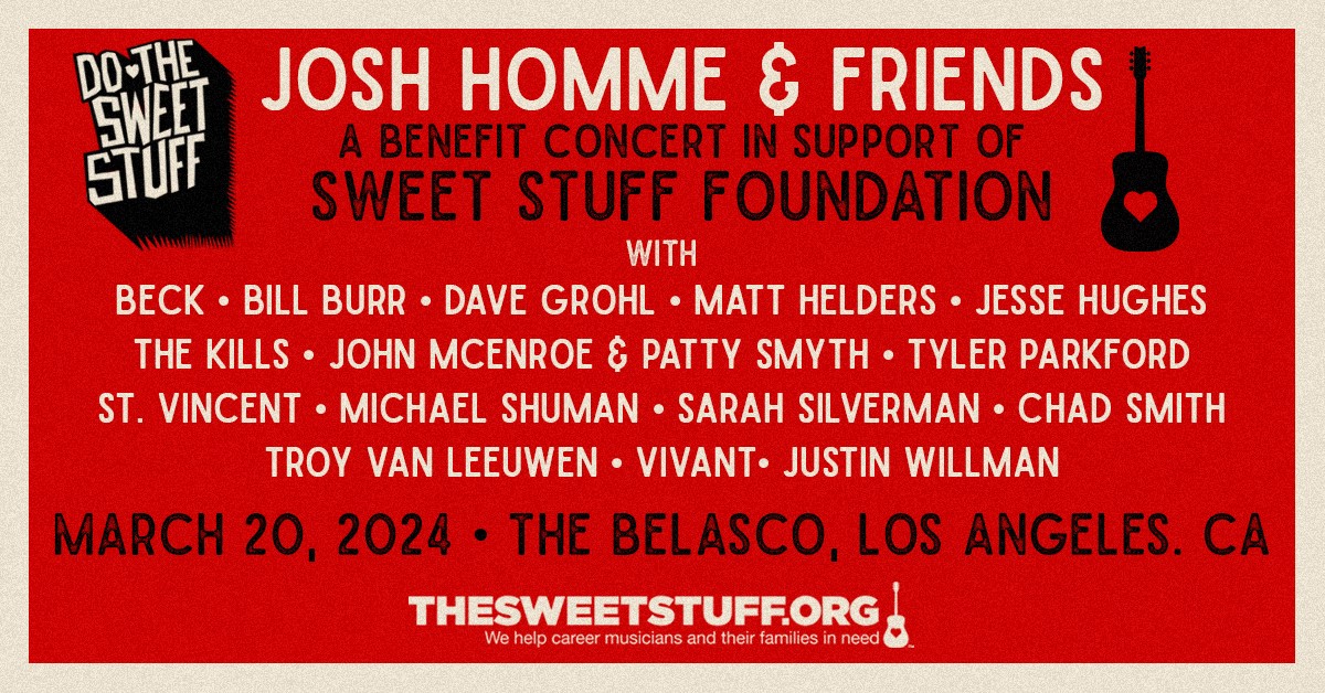 100% of proceeds from the show will benefit the Sweet Stuff Foundation, the non-profit created by the Homme family in 2013 to provide assistance to career musicians, recording engineers and their families struggling with illness and disability.