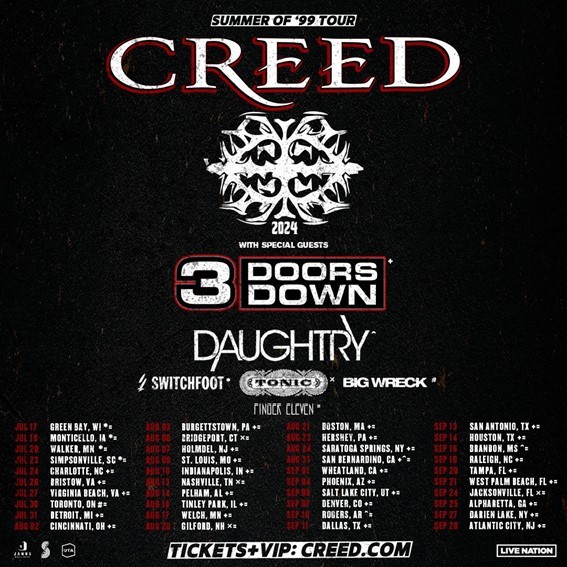 CREED, the multi-platinum, GRAMMY and American Music Award-winning rock band, is thrilled to announce their eagerly awaited 2024 Summer of ‘99 Tour.