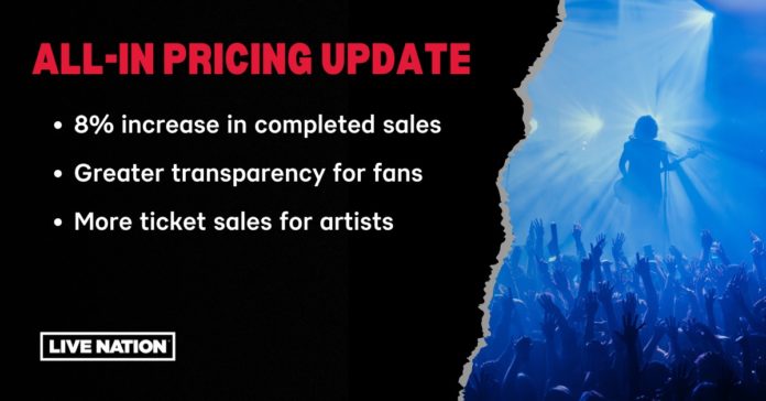 Live Nation Entertainment’s all-in pricing policy, which shows a ticket buyer the total price and fees associated with their transaction, has yielded an 8% increase in completed sales in the first six months the program rolled out across all Live Nation venues and festivals in the U.S. The industry-leading initiative has proven beneficial for both fans and artists, delivering greater transparency for fans while increasing sales for artists and fewer abandoned carts at checkout.