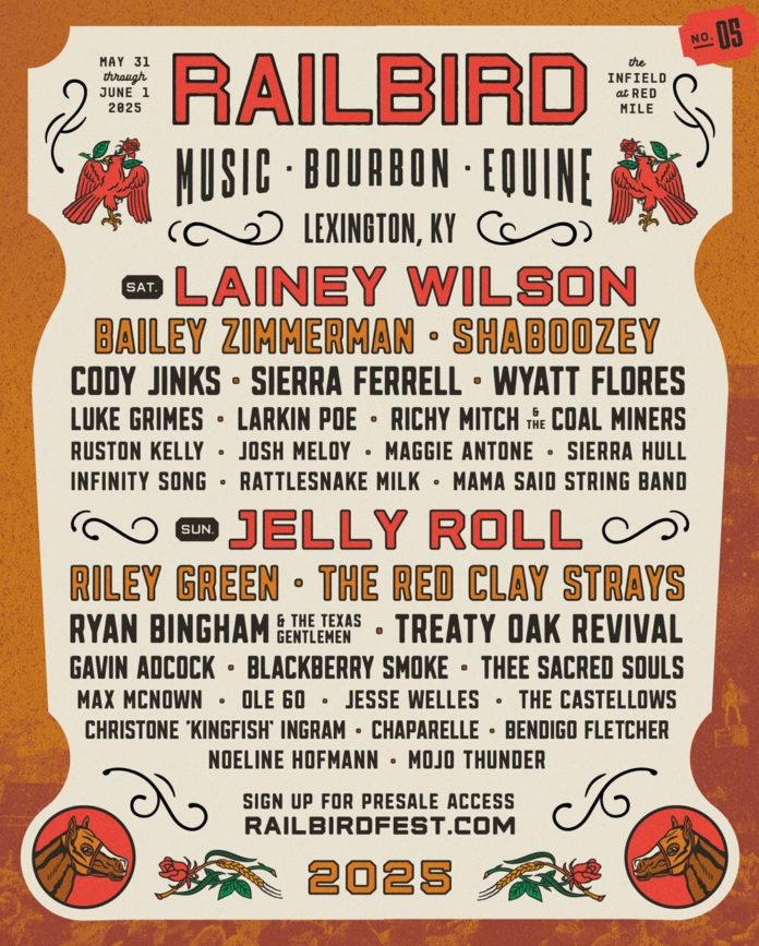 Jelly Roll and Lainey Wilson will headline the 2025 edition of Railbird Music Festival, taking place May 31 and June 1 at The Infield at Red Mile in Lexington, Kentucky. The 2-Day festival will bring together over 30 artists across three stages including Riley Green, Bailey Zimmerman, The Red Clay Strays, Shaboozey, Cody Jinks, Ryan Bingham & The Texas Gentlemen, Sierra Ferrell, Treaty Oak Revival, Wyatt Flores, Blackberry Smoke, Luke Grimes, Gavin Adcock and more to the grounds of the historic horse racing track for unforgettable performances and curated bourbon experiences, celebrating the spirit of Kentucky.