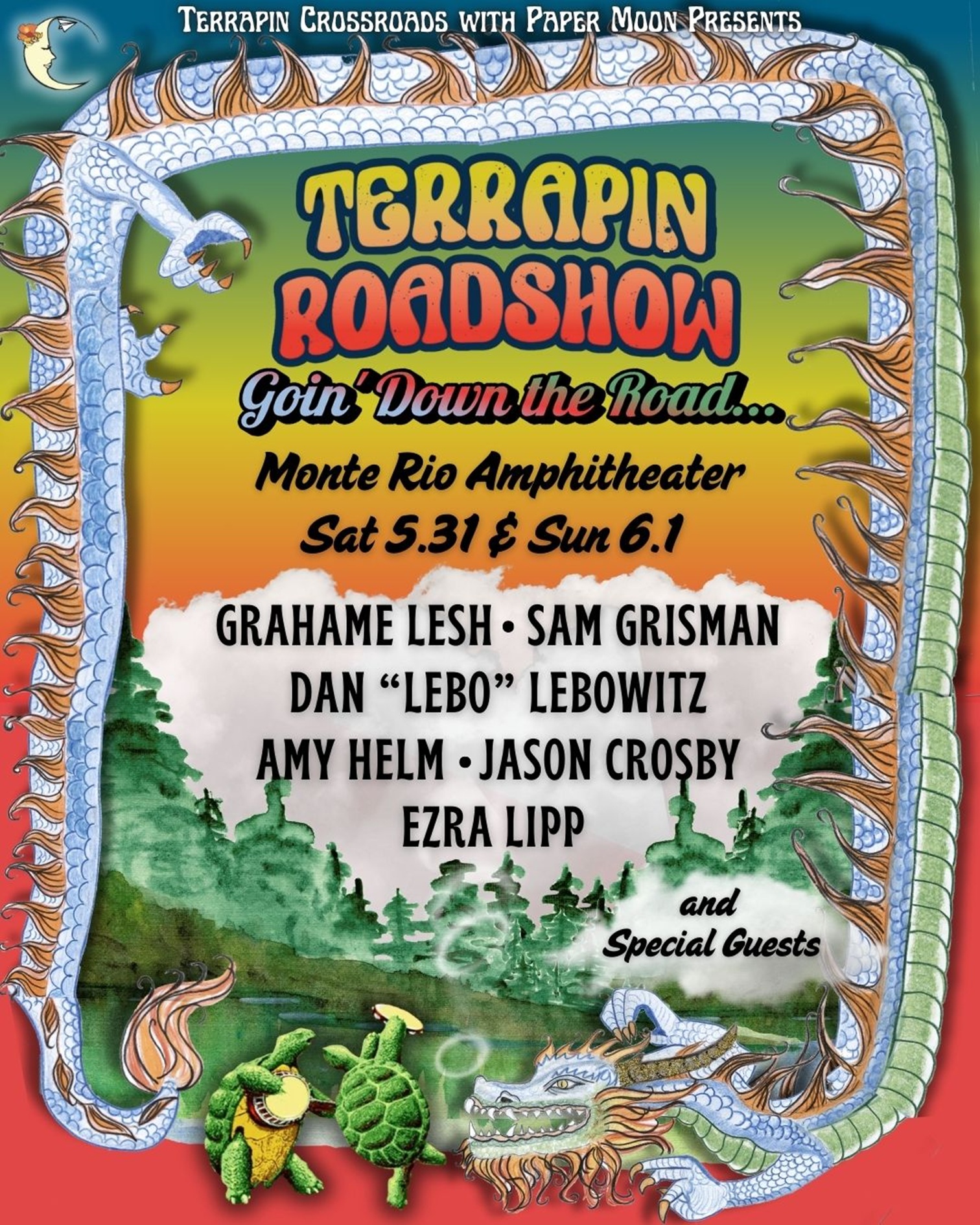 Terrapin Crossroads and Paper Moon Presents are thrilled to announce the lineup for the upcoming Terrapin Roadshow in Monte Rio on May 31 & June 1, featuring an all-star cast of musicians dedicated to carrying on the spirit of the Grateful Dead. Taking the stage at Monte Rio Amphitheater are Grahame Lesh, Sam Grisman, Dan “Lebo” Lebowitz, Amy Helm, Jason Crosby, Ezra Lipp, and special guests.