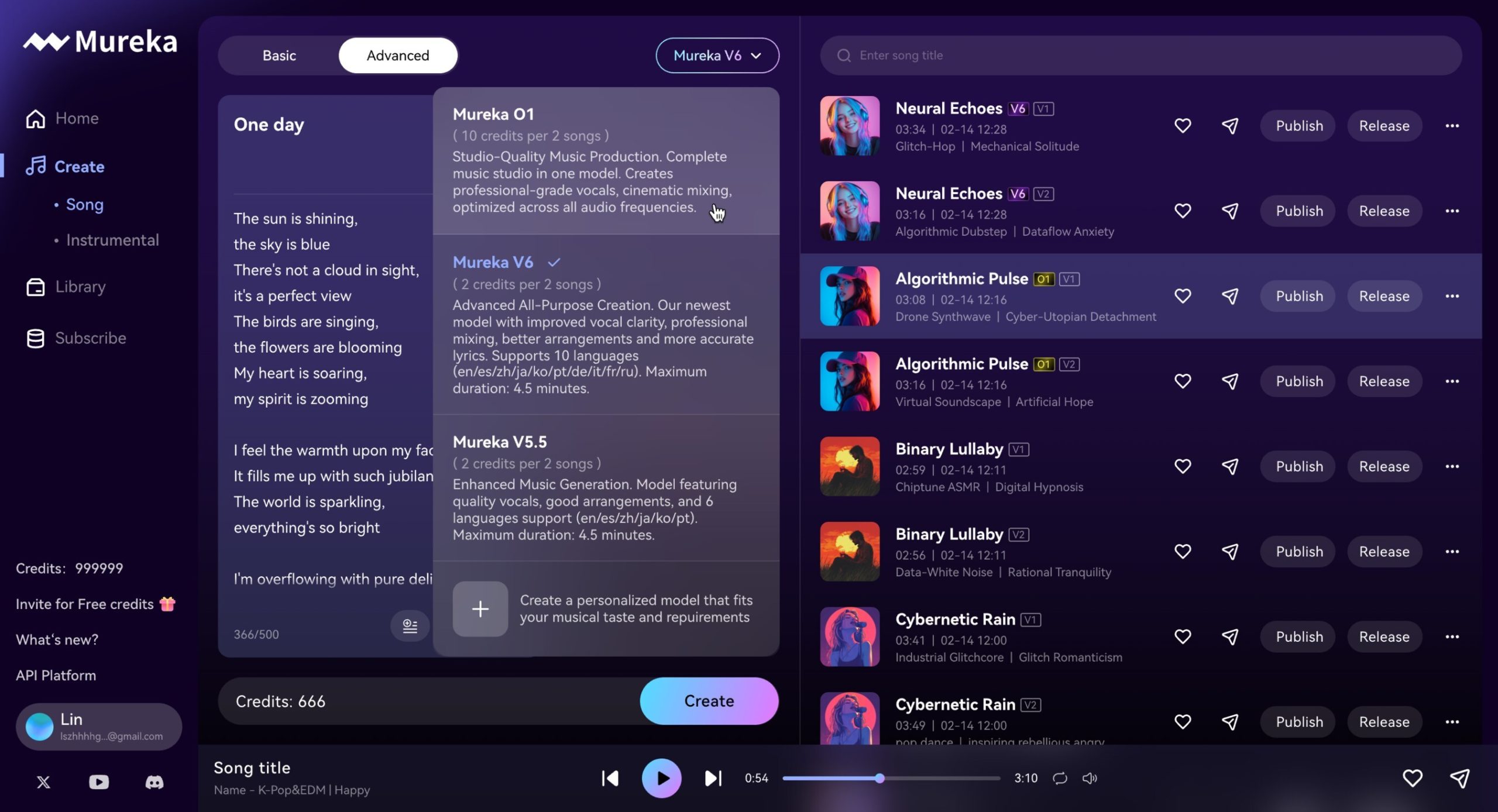 Mureka V6 is the current base model of Mureka, supporting pure music generation as well as AI music creation in ten languages, including English, Japanese, Korean, French, Spanish, Portuguese, German, Italian, Russian and Chinese. In Mureka V6, we have introduced our self-developed ICL (In-Context Learning) technology. This advancement brings several improvements: a more expansive soundscape, enhanced vocal texture, and improved mixing design.