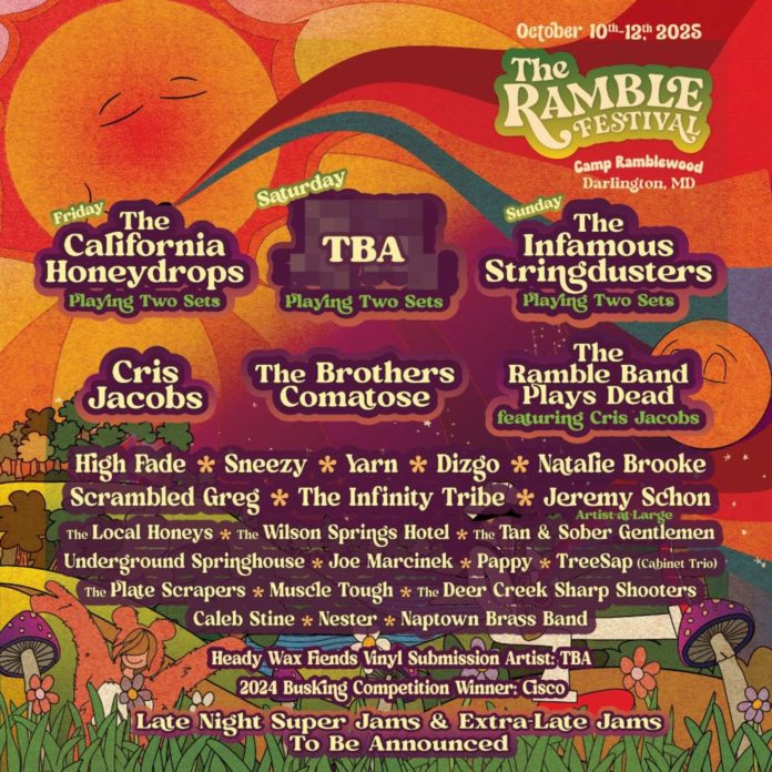 The fourth annual Ramble Festival, taking place just outside Darlington, MD will kick off on October 10th and is thrilled to unveil the 2025 artist lineup including The California Honeydrops, The Infamous Stringdusters, Cris Jacobs, The Brothers Comatose, The Ramble Band Plays Dead (ft. Cris Jacobs), High Fade, Pappy, TreeSap (Cabinet Trio), and many more. This festival is designed for those seeking more than just a music event—it’s a community festival that embraces creativity and connection.