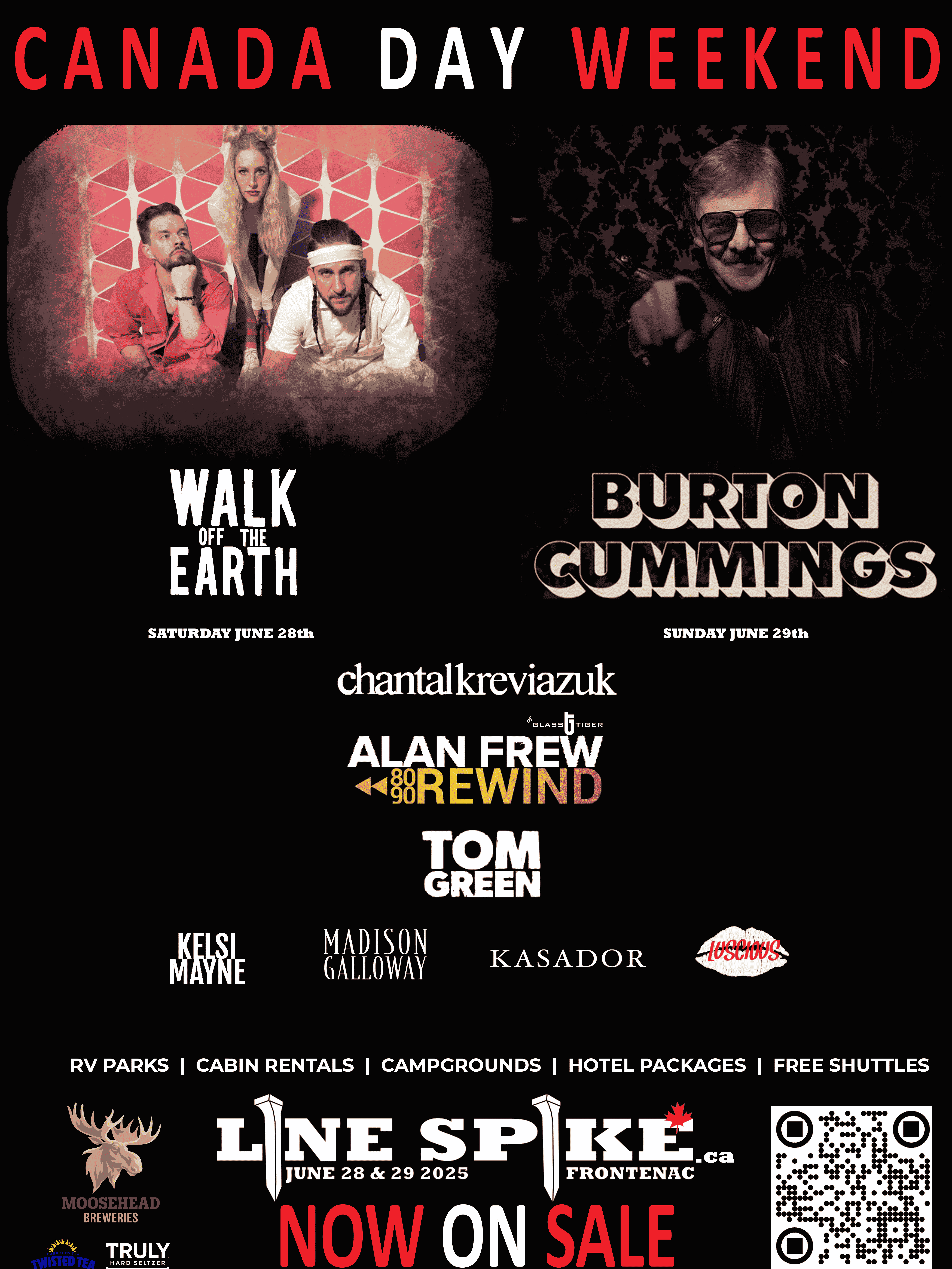 This June 28 and 29, 2025, Line Spike Frontenac 2025 will make history as one of the largest pre-Canada Day music events in the nation — a bold and brilliant “Power of Positivity Musical Harvest” set in the breathtaking hills of Frontenac County now officially announced at 3587 Harrowsmith Rd, Harrowsmith, ON. Bringing together musical icons and rising stars, the two-day festival promises an unforgettable celebration of community, inspiration, and unapologetic Canadian pride with legendary artists Burton Cummings, Walk Off The Earth, Chantal Kreviazuk, Alan Frew, Kelsi Mayne, Madison Galloway and just-announced KASADOR, Luscious, and Tom Green.