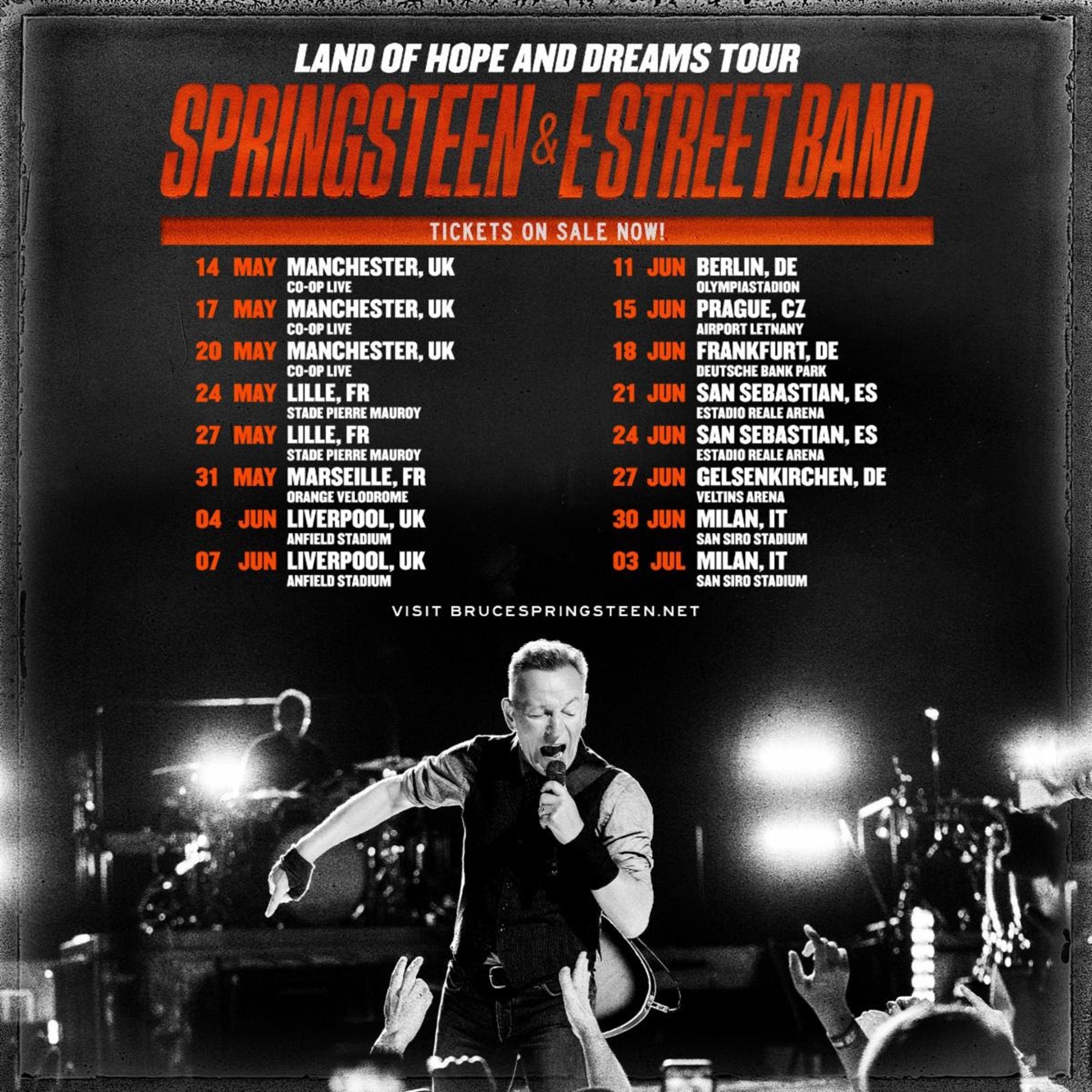Recent live highlights for Springsteen and The E Street Band include their first Asbury Park homecoming show in decades — “an already legendary live set” (Variety) called “one of the greatest post-reunion shows in Springsteen history” (Rolling Stone). In Europe, a multi-night run at London’s Wembley Stadium last summer “reminded us…no one does it better” (The Times) — while shows at Barcelona’s Estadi Olímpic saw the band “unleash euphoria” (El Correo) to over 130,000 fans. Each of this year’s tour dates will take place in a city that Springsteen and The E Street Band are yet to play since their 2023 return, concluding with two nights at the legendary San Siro Stadium in Milan, Italy on June 30 and July 3.