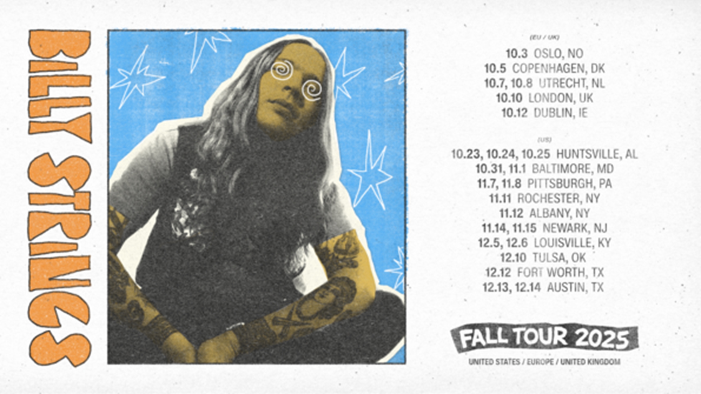 Tickets will go on sale this Friday, May 16, at 10:00 a.m. local time. Full details can be found at www.billystrings.com/tour.