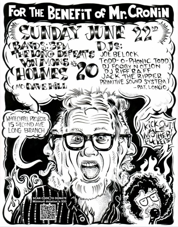 Earlier this year, Tim Cronin, original Monster Magnet member, beloved Ribeye Brother, and cherished Jack’s Record Shoppe stalwart, was diagnosed with ALS (Amyotrophic Lateral Sclerosis). Now, he needs our support. Join us on Sunday, June 22, at Whitechapel Projects in Long Branch, NJ, for a one-of-a-kind art auction and live music event to benefit Tim.