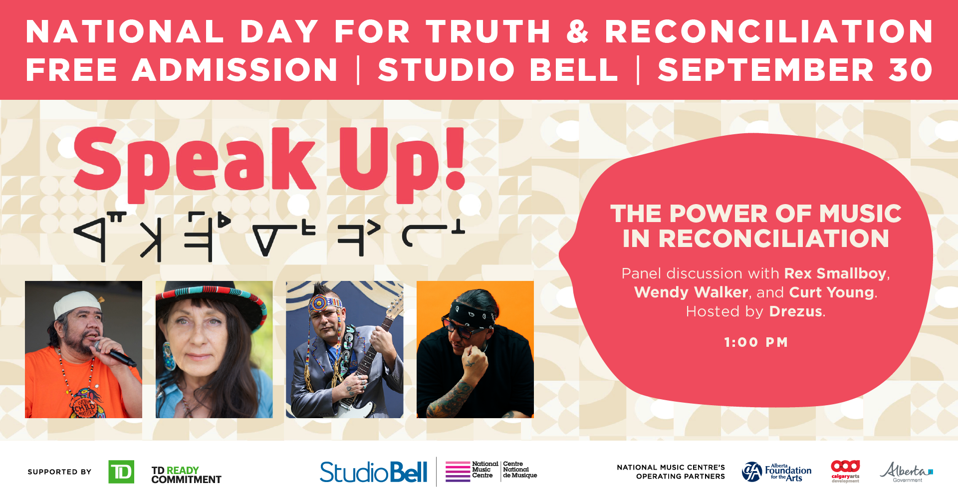 The Speak Up! exhibition and panel are supported by TD who, in 2025, renewed its support of NMC’s Indigenous programming through the OHSOTO’KINO initiative, so named after a Blackfoot phrase that means ‘to recognize a voice of.’ OHSOTO’KINO is led by NMC’s Indigenous Programming Advisory Committee, who act as a guiding voice for exhibitions and programs at Studio Bell.