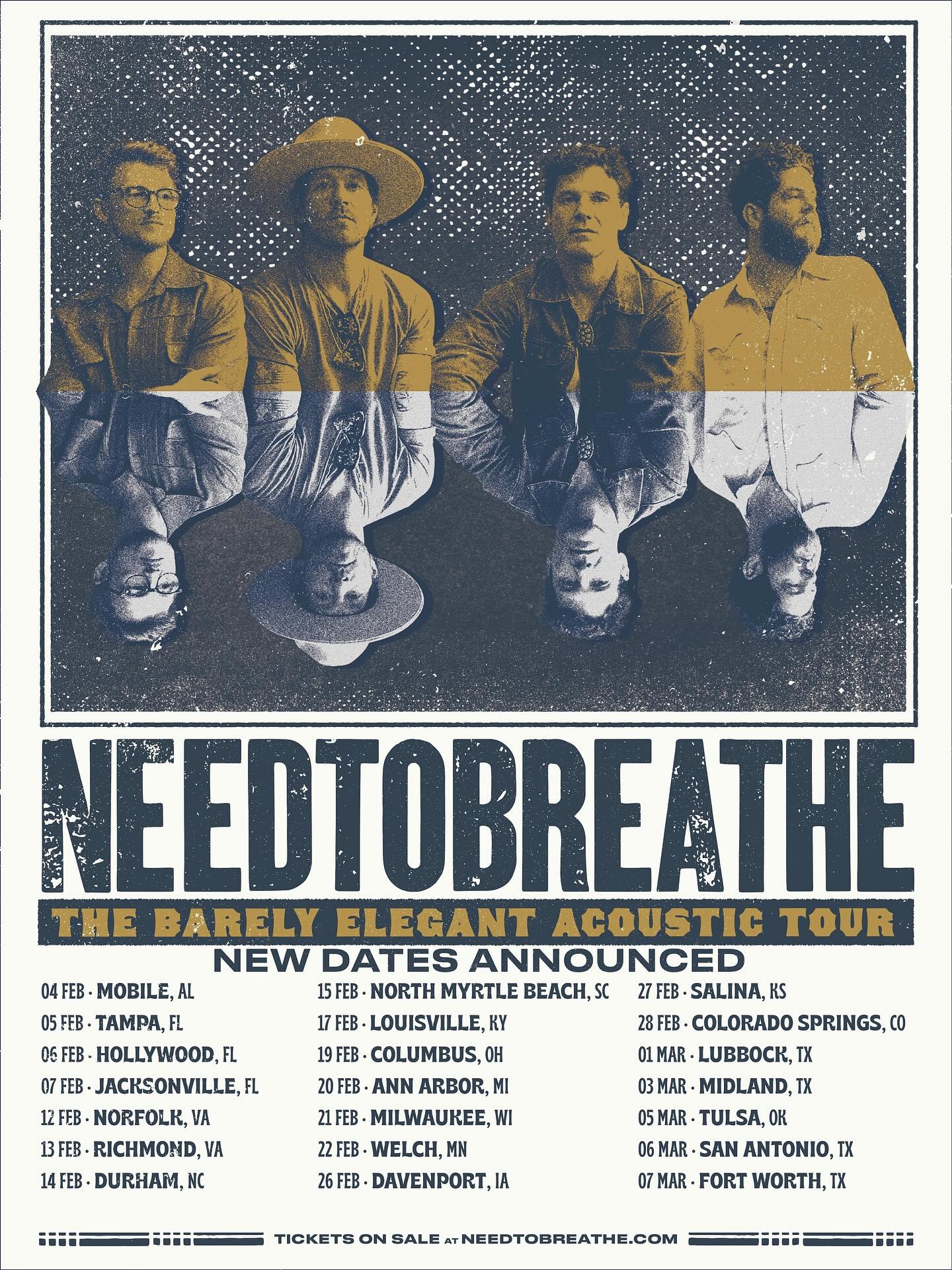 Due to overwhelming demand, the award-winning, multi-platinum band Needtobreathe announces additional cities on their Barely Elegant Acoustic Tour. The tour includes 21 new dates kicking off on February 4, 2026, in Mobile, AL, and will hit major markets across the country, including Jacksonville, FL, Columbus, OH, and Fort Worth, TX.