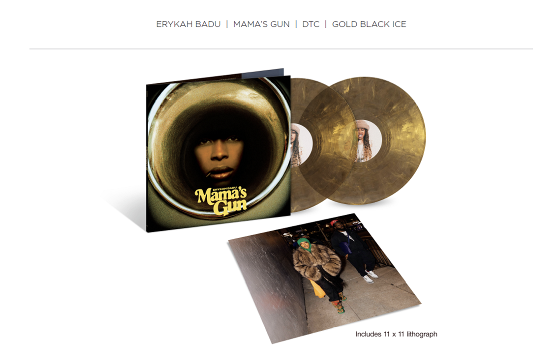 Five-time GRAMMY Award-winning neo-soul trailblazer Erykah Badu commemorates the 25th anniversary of her influential sophomore album, Mama’s Gun, with the release of new limited-edition Vinyl options out January 23, 2026. The 2LP UMe Ecomm variant is pressed on Gold Black Ice Vinyl and features a newly redesigned gatefold jacket, alternate cover, and special lithograph. Pre-order HERE.