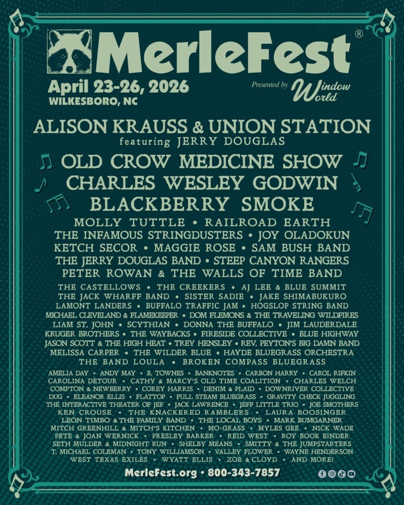 MerleFest has released the full, spectacular lineup for its 2026 roots conclave, joining previously announced headliners like Alison Krauss & Union Station featuring Jerry Douglas, Charles Wesley Godwin, and Blackberry Smoke for the event running April 23-26. A massive highlight will be Old Crow Medicine Show, celebrating the 20th anniversary of their quintessential album ‘Big Iron World’ by performing that album and its predecessor ‘O.C.M.S.’ in full on the legendary Watson Stage. Furthermore, Old Crow Medicine Show will act as ring leaders for the must-see Saturday night Late Night Jam, an event that is deeply intertwined with MerleFest’s history since Doc Watson found the band busking in downtown Boone in 2000. In addition to the headliners, the festival welcomes a huge roster of talent including Molly Tuttle, Railroad Earth, The Infamous Stringdusters, Sam Bush, The Jerry Douglas Band, Jake Shimabukuro, Jim Lauderdale, and the Kruger Brothers, among many others.