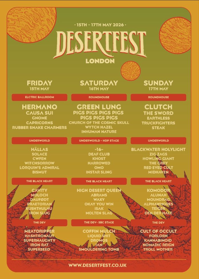 Desertfest London has officially completed its 2026 lineup, revealing the day and stage splits for its fourteenth year of rock fury. Taking place from May 15th to 17th across Camden, the festival is set to feature a massive collection of stoner rock, doom, and underground heavy music. Friday night kicks off with a heavy stoner set headlined by the legendary John Garcia and Hermano at the Electric Ballroom, while Florida sludge pioneers Cavity mark their reunion by headlining the Black Heart stage. Saturday shifts the focus to “Best of British” talent, with local favorites Green Lung headlining the Roundhouse alongside new additions like Wytch Hazel and Church of the Cosmic Skull. The weekend concludes on Sunday with the highly anticipated festival debut of Clutch, who will finally take the Roundhouse stage for an exclusive UK performance.