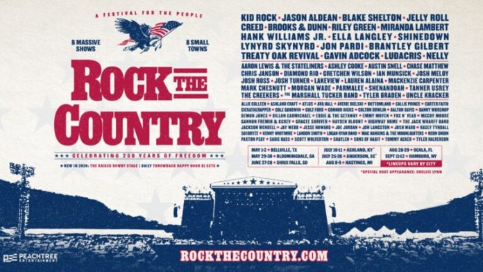 Rock The Country Tour returns in 2026 with eight multi-city stops celebrating America’s 250th anniversary through rotating lineups and expanded fan experiences. Peachtree Entertainment announced the festival will visit Bellville, Bloomingdale, Sioux Falls, Ashland, Anderson, Hastings, Ocala, and Hamburg across two-day events from May through September. Artists performing across select dates include Kid Rock, Jelly Roll, Jason Aldean, Blake Shelton, Creed, Brooks & Dunn, Riley Green, Miranda Lambert, Hank Williams Jr., Shinedown, Jon Pardi, Ella Langley, Lynyrd Skynyrd, Brantley Gilbert, Treaty Oak Revival, Gavin Adcock, Ludacris, and Nelly, with daily throwback happy hour DJ sets and special host appearances by Chelcie Lynn in select markets. Each stop features unique lineups with no two weekends repeating the same artist combination.