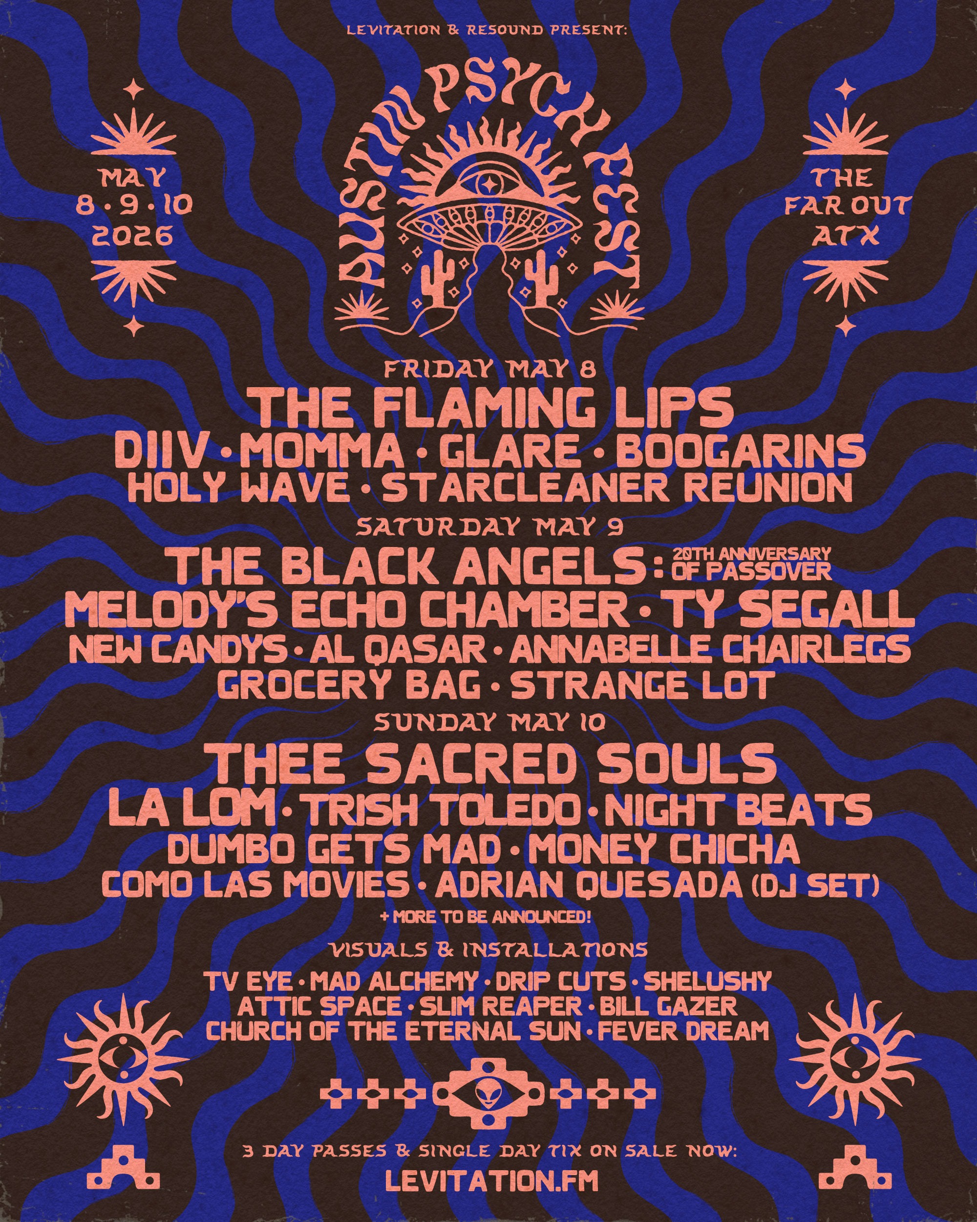 Friday, May 8 is headlined by The Flaming Lips, joined by DIIV, Momma, Glare, Boogarins, Holy Wave, and Starcleaner Reunion. Saturday, May 9 is led by The Black Angels, performing ‘Passover’ in full, with Melody’s Echo Chamber, Ty Segall, New Candys, Al Qasar, Grocery Bag, Annabelle Chairlegs, and Strange Lot also appearing.