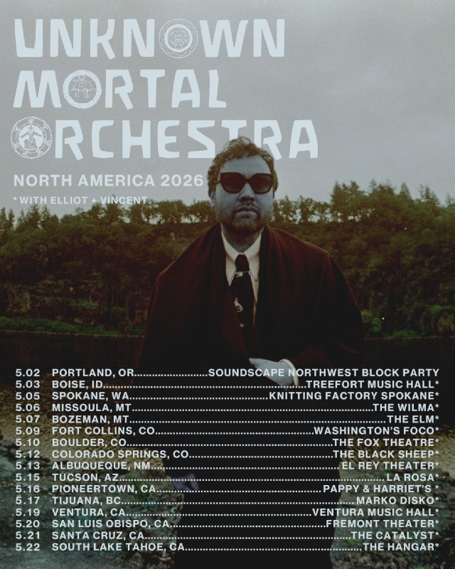 Unknown Mortal Orchestra will bring their acclaimed two-hour, no-setlist live show to select North American cities this spring. The run continues support for their 2025 instrumental album ‘IC-02 Bogotá’ and the six-song EP ‘Curse’, following a European tour scheduled from March 10 through April 2.