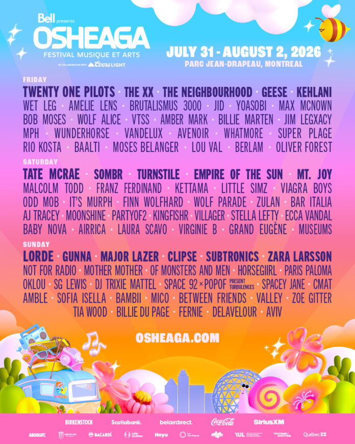 | THE FULL LINEUP FOR OSHEAGA 2026 IS HERE! TWENTY ONE PILOTS, TATE McRAE, LORDE & MORE PLUS: THE XX, EMPIRE OF THE SUN, SOMBR, GUNNA, TURNSTILE, MAJOR LAZER, GEESE, WOLF PARADE, AND MANY MORE! OSHEAGA Music and Arts Festival, presented by Bell in collaboration with Coors Light, returns for its 19th edition, once again transforming Montréal’s stunning Parc Jean-Drapeau into the epicentre of live music from July 31 to August 2, 2026. Over three unforgettable days, festivalgoers will experience world-class performances, genre-defining artists, and the electric atmosphere that has made OSHEAGA one of North America’s most celebrated summer festivals. For 2026, OSHEAGA unveils its complete lineup in one highly anticipated reveal, spotlighting three major headliners set to deliver landmark performances. True to its reputation, the festival’s booking team has curated a dynamic program that bridges genres and generations, bringing together global superstars, rising talent, and tomorrow’s breakout acts all in one place. With 87 artists across multiple stages, this year’s edition invites music lovers to discover their next obsession. |