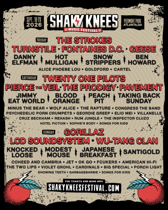 Twenty One Pilots, The Strokes and Gorillaz will headline the 13th edition of Shaky Knees Music Festival, returning September 18-20 to Atlanta’s crown jewel, Piedmont Park. The stacked lineup will bring over 50 performances across four stages including LCD Soundsystem, Pierce The Veil, Turnstile, Wu-Tang Clan, The Prodigy, Fontaines D.C., Pavement, Geese, Knocked Loose, Danny Elfman, Modest Mouse, Blood Orange, Jimmy Eat World, Hot Mulligan and many more. Fans can sign up now for the festival SMS list at ShakyKneesFestival.com to receive a passcode to the presale beginning Thursday, February 26 at 9am ET with access to the guaranteed lowest-priced tickets from 9am to 10am ET. 1-Day, 2-Day and 3-Day ticket types will be available including GA, GA+, VIP, Platinum and Ultimate, plus 3-Day group Cabanas and Bungalows. Any remaining tickets will go on sale to the public following the presale.