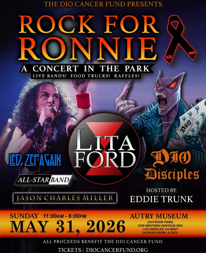 The annual “Rock for Ronnie Concert in the Park” returns to Griffith Park on Sunday, May 31, 2026, to benefit the Ronnie James Dio Stand Up and Shout Cancer Fund. This year’s lineup features a headline performance from Lita Ford along with sets from tribute acts Led Zepagain and Whole Lot of Rosies. The bill also includes Dio Disciples, Jason Charles Miller, and British hard rock veterans Legs Diamond. Los Angeles up-and-comers Saints of Sinners will round out the day’s music. Eddie Trunk hosts the event, which runs from 11:00 AM to 6:00 PM on the South Lawn of the Autry Museum.