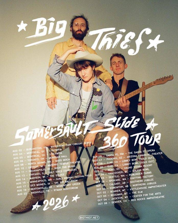 Big Thief have announced the second North American leg of their “Somersault Slide 360 Tour,” running August through October 2026. The new dates open August 2 in Burlington, Vermont and close October 6 at Red Rocks Amphitheatre outside Denver, with stops in Toronto, Detroit, Chicago, Minneapolis, Nashville, Seattle, Vancouver, and more. Artist presale begins Wednesday, March 11 at 10am local time, with general on-sale Friday, March 13 at 10am local time.