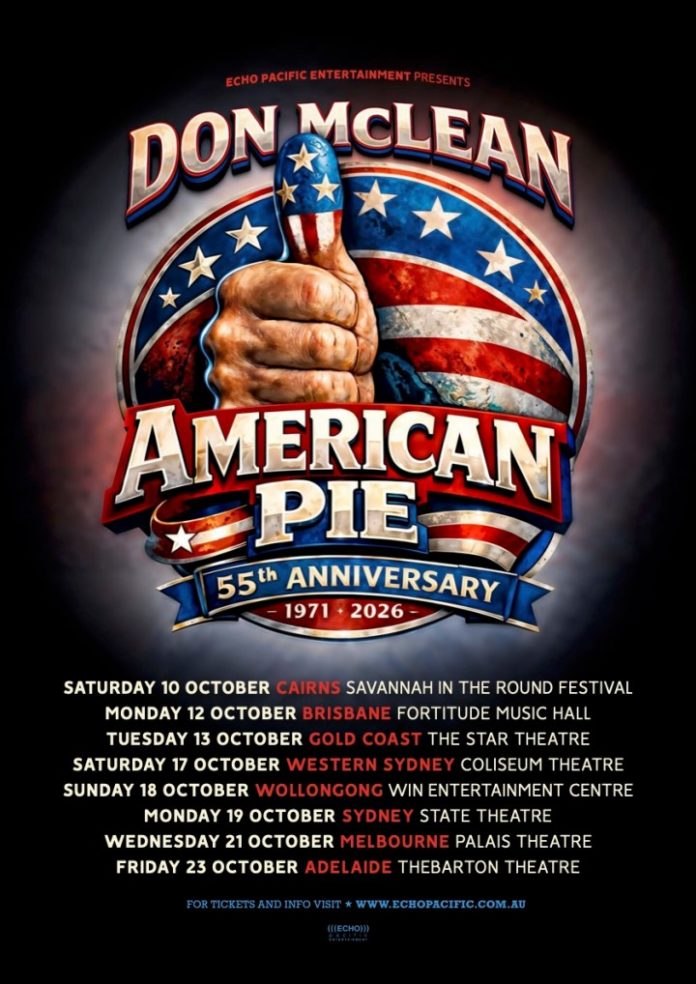 Fifty-five years on, “American Pie” still commands a room. Don McLean is heading to Australia this October for The American Pie 55th Anniversary Tour, eight dates across the country that mark yet another chapter in one of the most enduring careers in American songwriting. At 81, McLean remains a commanding stage presence, delivering “American Pie,” “Vincent (Starry, Starry Night),” “Castles in the Air,” “And I Love You So,” and more with the warmth and vocal clarity that has carried these songs across five decades. Australian presale begins March 27 at 10am local time, with general on-sale opening March 31 at 9am local time via echopacific.com.au.
