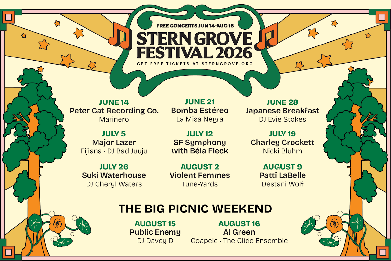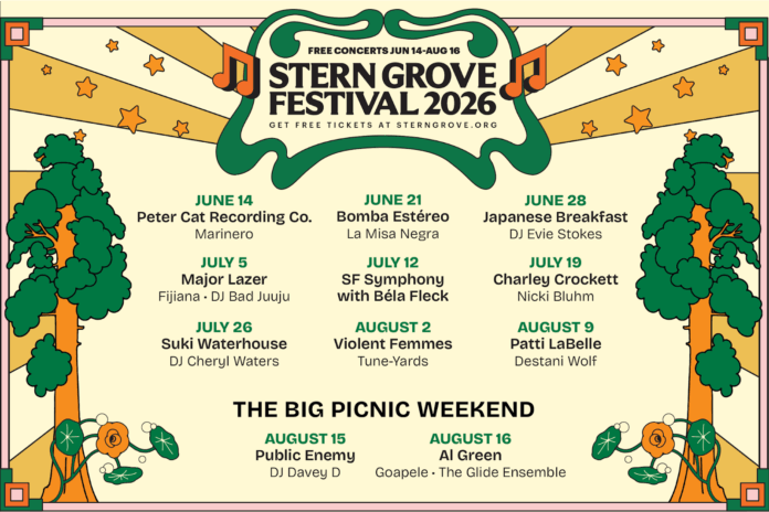 Eighty-nine years in, Stern Grove Festival still does what almost no one else does: world-class live music, completely free. San Francisco’s longest-running summer tradition returns June 14 through August 16, 2026, with a lineup that spans Al Green, Public Enemy, Patti LaBelle, Major Lazer, Japanese Breakfast, Violent Femmes, Suki Waterhouse, Charley Crockett, and Bomba Estéreo, among others. Free tickets are available via lottery at sterngrove.org.