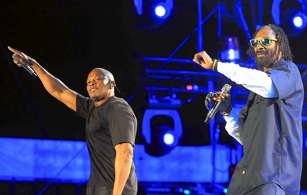 The lasting influence of gangsta rap that entered the mainstream after the 1992 L.A. riots was seen at this year’s Coachella festival, where Dr. Dre, left, and Snoop Dogg closed. They collaborated on Dre’s “The Chronic,” which came out after the riots and, says a former rap magazine editor, “captures that moment.” (Luis Sinco / Los Angeles Times)