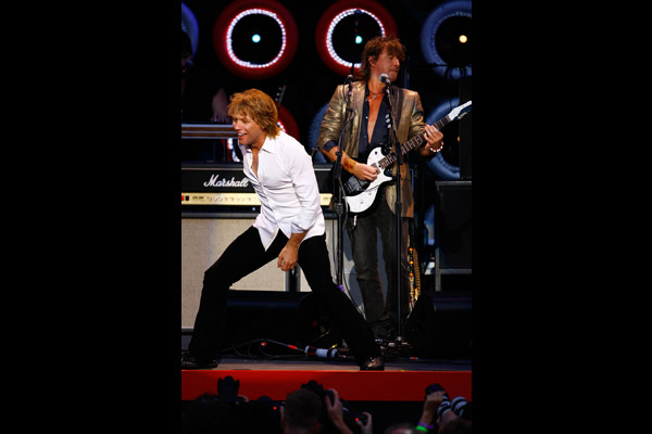 Richie Sambora (L) and Jon Bon Jovi of “Bon Jovi” perform onstage during Live Earth New York at Giants Stadium on July 7, 2007 in East Rutherford, New Jersey. (Photo by Mat Szwajkos/Getty Images)
